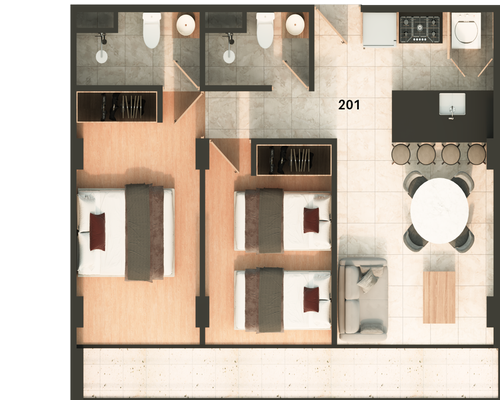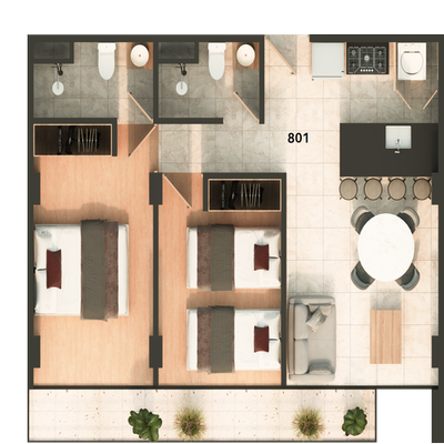 Los acabados premium elevan cada espacio: la cocina destaca por su diseño contemporáneo y materiales de alta gama, mientras que el porcelanato aporta distinción y armonía en las áreas sociales. En las recámaras, los pisos SPC brindan una combinación perfecta de confort, resistencia y calidez bajo cada paso.